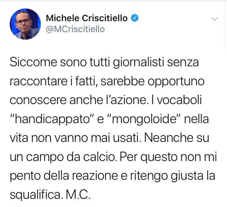 Inibizione e divieto assoluto di svolgere qualsiasi attività da dirigente, ma non si è fatta attendere la replica del collega di Sportitalia, che ha commentato così sul suo profilo Twitter: “Siccome sono tutti giornalisti senza raccontare i fatti, sarebbe opportuno conoscere anche l’azione. I vocaboli handicappato e mongoloide, nella vita non vanno mai usati. Neanche su un campo da calcio. Per questo non mi pento della reazione e ritengo giusta la squalifica!”.
