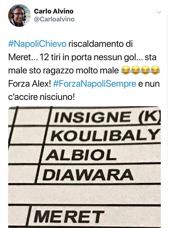 “Riscaldamento di Meret… 12 tiri in porta nessun gol… Sta male sto ragazzo molto male (ride, ndr)! Forza Alex, #ForzaNapoliSempre e Nun c’accire nisciuno!”