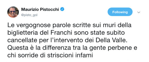 A commentarle è stato anche il giornalista Maurizio Pistocchi con un tweet alquanto polemico: “Le vergognose parole scritte sui muri della biglietteria del Franchi sono state subito cancellate per l’intervento dei Della Valle. Questa è la differenza tra la gente perbene e chi sorride di striscioni infami“. Che si riferisca agli episodi del derby di Torino?