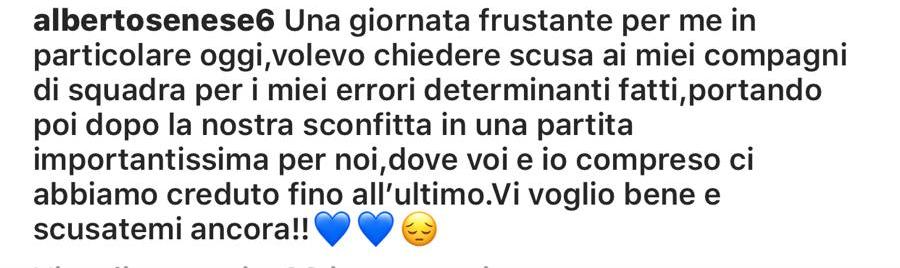 Il calciatore, sostituito subito dopo lo sbaglio, ha però voluto chiedere scusa a compagni e tifosi. Lo ha fatto tramite un messaggio pubblicato sul suo profilo Instagram.