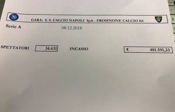 Sono arrivati i dati relativi allo stadio San Paolo per gli spettatori presenti e l’incasso dei botteghini per Napoli-Frosinone.