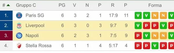 La classifica finale recita: PSG 11; Liverpool 9; Napoli 9; Stella Rossa 4. Decisiva la differenza reti segnate, con i Reds a quota 9, mentre i ragazzi di Ancelotti si sono fermati a 7.