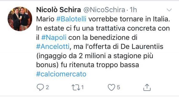 Nicolò Schira, giornalista della Gazzetta dello Sport, ha pubblicato sul suo profilo Twitter un post riguardante un forte interessamento del Napoli nei confronti di Mario Balotelli la scorsa estate.