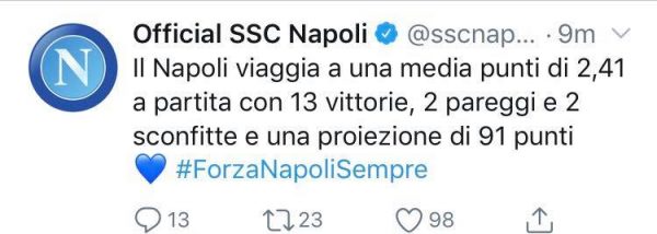 “Il Napoli viaggia a una media punti di 2,41 a partita con 13 vittorie, 2 pareggi e 2 sconfitte e una proiezione di 91 punti. Forza Napoli Sempre!”