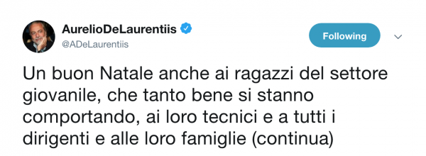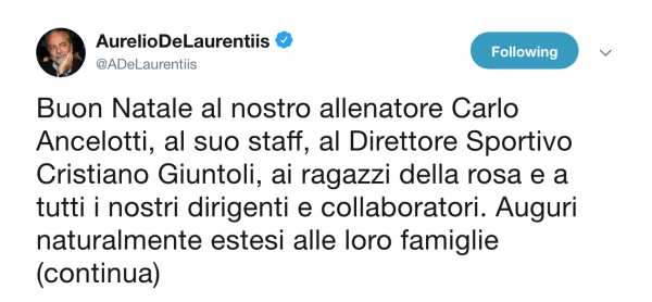 “Buon Natale al nostro allenatore Carlo Ancelotti, al suo staff, al Direttore Sportivo Cristiano Giuntoli, ai ragazzi della rosa e a tutti i nostri dirigenti e collaboratori. Auguri naturalmente estesi alle loro famiglie. Un buon Natale anche ai ragazzi del settore giovanile, che tanto bene si stanno comportando, ai loro tecnici e a tutti i dirigenti e alle loro famiglie. E infine, un buon Natale a tutti i nostri numerosissimi tifosi e simpatizzanti in Italia e nel mondo e a tutti i napoletani. Forza Napoli Sempre #ADL”.