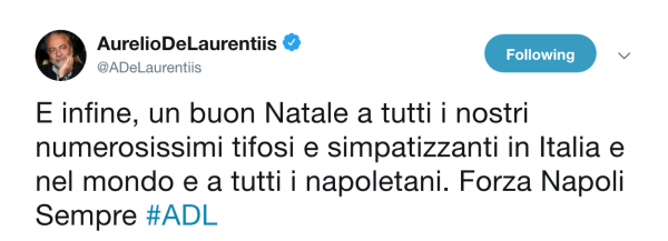 Il presidente del Napoli, Aurelio De Laurentiis, ha fatto – attraverso il suo profilo Twitter – gli auguri di buon Natale a tutti i tifosi azzurri, senza dimenticare tutti i tesserati della società. Di seguito il messaggio: