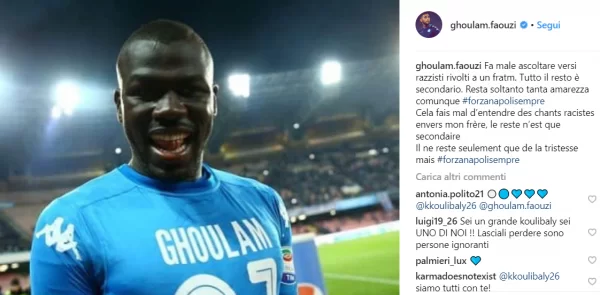 Solidarietà da parte di Faouzi Ghoulam, nei confronti di Kalidou Koulibaly, espulso per un applauso ironico in una gara dove ululati e cori razzisti sono stati interminabili.