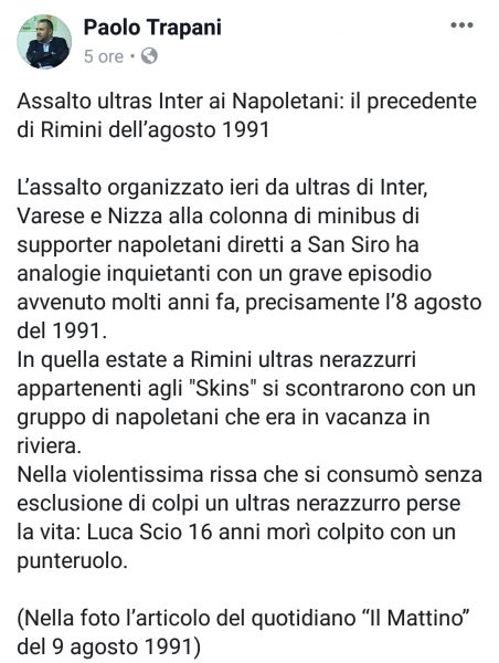 Gli episodi di violenza svoltisi nella serata di ieri all’esterno dello Stadio Giuseppe Meazza di Milano non sono i primi a coinvolgere le “tifoserie” di Napoli ed Inter. Come riportato infatti dal collega Paolo Trapani, tramite il suo account Facebook nell’agosto del 1991 un episodio simile portò alla morte di un giovane tifoso nerazzurro all’esterno di un locale della riviera romagnola: