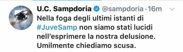 Però la stessa società blucerchiata ha fatto immediatamente un passo indietro, chiedendo scusa per quanto detto al termine della gara. Questo il messaggio di rettifica su Twitter: