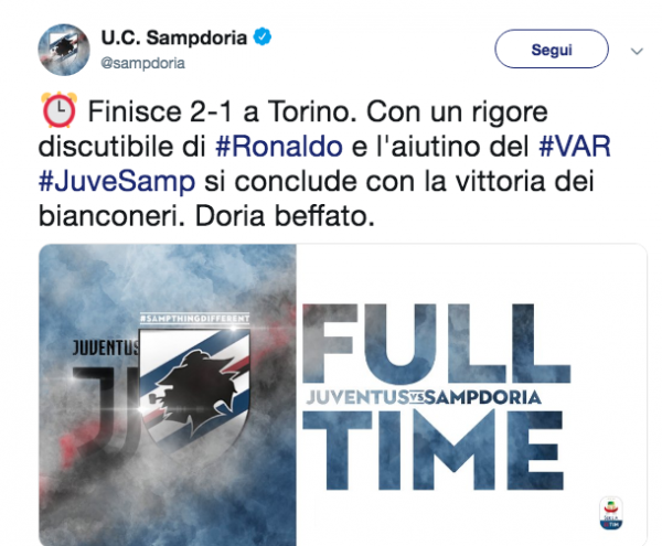 La Sampdoria non ci sta ed ecco che arriva un tweet molto forte contro le scelte da parte del direttore di gara Valeri. Questo quanto scritto sul profilo twitter ufficiale della Sampdoria: