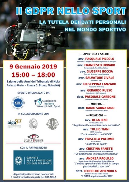 La tutela della privacy nel mondo sportivo, è questo il tema del convegno inaugurale dell’Associazione Italiana Avvocati dello Sport insieme con la Scuola ADG- Alta Docenza Giudica, con il patrocinio del Garante per la protezione dei dati personali. Si terrà il 9 Gennaio ore 15.00, presso il Salone delle Armi del Tribunale di Nola, l’evento che vede affrontare il tema del GDPR (General Data Protection), il regolamento europeo sulla tutela dei dati personali, nel mondo sportivo.