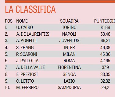 La società Reputation Science ogni mese stila l’indice di gradimento dei presidenti della Serie A in base ad un’ indagine fatta analizzando news, menzioni, blog e tutto ciò ce riguarda i social network. Questo mese il podio è composto da Urbano Cairo, Aurelio De Laurentiis e Andrea Agnelli. Ecco un estratto dell’edizione odierna della Gazzetta dello Sport che analizza la classifica: