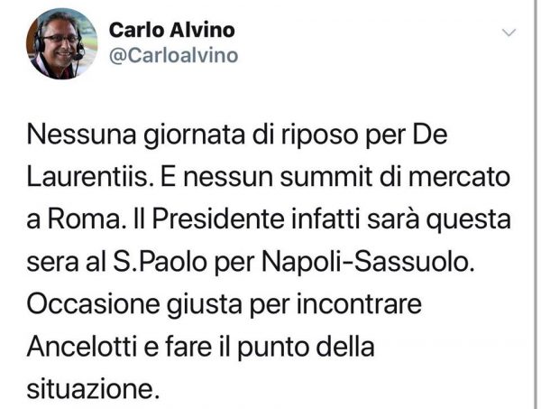 Assisterà alla partita, ma non sarà lì solo per quello. Infatti, secondo quanto riportato da Carlo Alvino tramite un messaggio su Twitter, “Nessuna giornata di riposo per De Laurentiis. E nessun summit di mercato a Roma. Il Presidente infatti sarà questa sera al San Paolo per Napoli-Sassuolo. Occasione giusta per incontrare Ancelotti e fare il punto della situazione”.