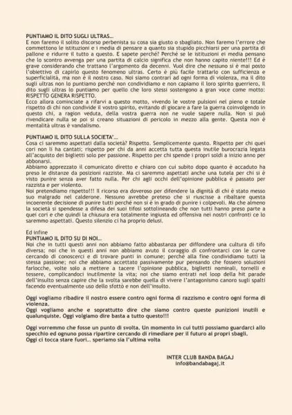Ma i tifosi nerazzurri sono pronti a rispondere, facendo un mea culpa per quanto accaduto. Partono dalle istituzioni, passano per gli ultras, fino ad arrivare al tifo “tranquillo” ed alla società. Questo il messaggio dei supporters nerazzurri, diffuso dal giornalista interista Fabrizio Biasin su twitter: