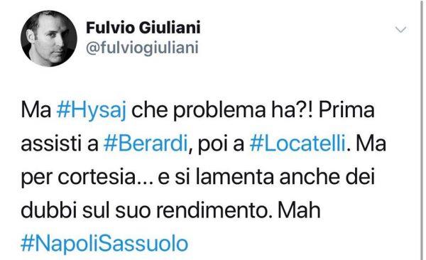 Tra questi anche il giornalista Fulvio Giuliani, che su twitter ha scritto: “Ma Hysaj che problemi ha!? Prima assist a Berardi, poi a Locatelli. Ma per cortesia… e si lamenta anche dei dubbi sul suo rendimento. Mah”.