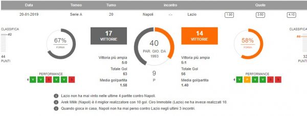La Juventus è scappata a +9 e non dà segni di cedimento. Poco importa, Carlo Ancelotti ha dettato la linea: continuare a macinare e a mettere punti al sicuro. E il Napoli ha recepito benissimo: solo una sconfitta nelle ultime cinque partite, quella di San Siro contro l’Inter, ora lontana solo cinque distanze in classifica. Per continuare a vincere c’è da sfruttare il fattore campo, dove l’ultima sconfitta è quella di marzo 2018 nel 2-4 inflitto dalla Roma, e uno score positivo contro la Lazio. I biancocelesti, negli ultimi tre incontri all’ombra del Vesuvio, hanno perso 2 volte e pareggiato 1, tornando a casa con 10 gol complessivi. L’ultima vittoria laziale risale al 2015, quando alla doppietta di Higuain risposero Parolo, Candreva, Onazi e Klose. Alla luce di questi dati, secondo quanto riporta Gioco Digitale, sarebbe facile puntare sul segno 1 pagato 1.90 volte la posta. Oppure scommettere sul dato dei gol: 4 degli ultimi 5 incontri tra le due squadre sono terminati con entrambe le porte violate e tenendo conto che da una parte ci sarà Milik e dall’altra Immobile, entrambi a 10 centri, non sarebbe male andare sul segno Gol Sì quotato 1.70.