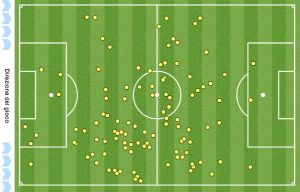 La mappa dei suoi movimenti in campo mostra chiaramente come l’ex Betis si sia inoltre trasformato in un tuttocampista. Da mediano a regista, da esterno ad attaccante. A destra come a sinistra, per poi passare nuovamente al centro. Fabiàn Ruiz è quel calciatore moderno in grado di far fare alla propria squadra il salto di qualità, più comunemente detto top player. E il Napoli, grazie al chico spagnolo, il salto di qualità l’ha decisamente fatto.