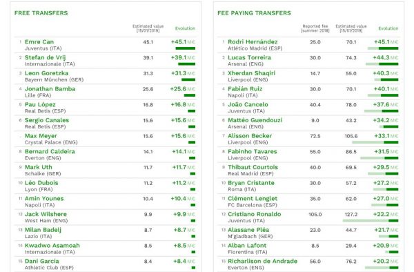 Anche il Napoli è presente nelle due classifiche. Per quanto riguarda la graduatoria dei parametri zero, i partenopei sono rappresentati da Younes che ha un valore di €10,4 mln. Nella classifica dei migliori acquisti è presente invece Fabiàn Ruiz, che dai 30 milioni pagati dal Napoli per la clausola rescissoria al Betis Siviglia, ha già incrementato il suo valore fino a €70, 1 mln.
