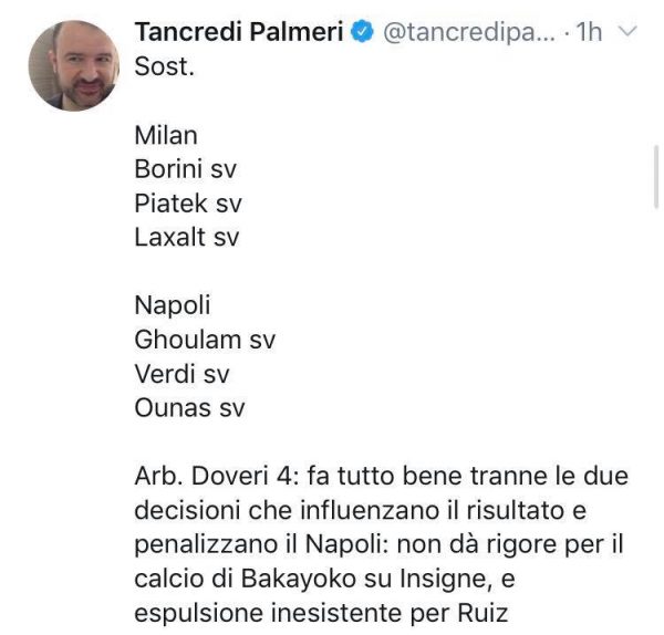Tancredi Palmeri, giornalista di BeIn Sport, ha commentato le decisioni dell’arbitro Doveri, accusato di aver penalizzato il Napoli contro il Milan. Ecco il post apparso sul suo profilo Twitter: