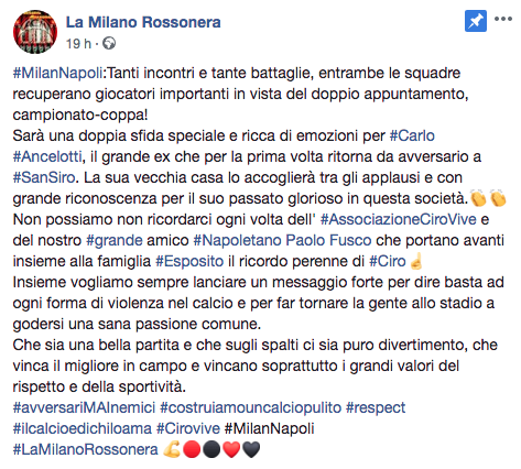 Questo il messaggio da parte della pagina Facebook La Milano Rossonera:
