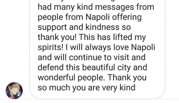 “Ho ricevuto tanti messaggi di solidarietà da molti napoletani che mi hanno offerto supporto e gentilezza. Tutto questo ha risollevato il mio spirito. Amerò sempre Napoli, continuerò a visitare e a difendere questa bellissima città e le sue meravigliose persone.”