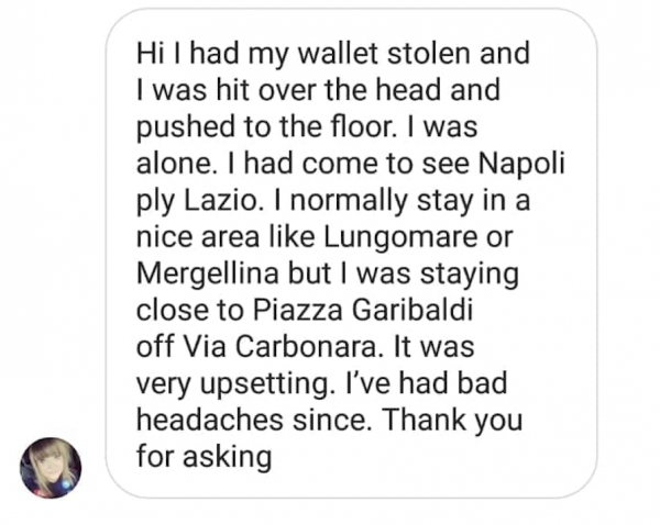 Attraverso qualche domanda fatta a Simona via chat siamo riusciti a ricostruire l’accaduto: “Mi hanno rubato il portafogli, sono stata colpita alla testa e spinta a terra. Ero sola. Sono venuta a vedere Napoli-Lazio, sono solita ad alloggiare in zone gradevoli come il lungomare, ma in quel momento ero a Via Carbonara, vicino Piazza Garibaldi. È stato molto traumatico, ho dei forti mal di testa da quel momento”.