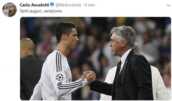 In occasione del compleanno di Cristiano Ronaldo, che compie oggi 35 anni, anche Carlo Ancelotti ha voluto fare gli auguri al campione portoghese tramite il suo profilo Twitter.L’attaccante della Juventus è stato suo calciatore ai tempi di Madrid, con il quale il tecnico di Reggiolo riuscì ad interrompere la maledizione Champions del Real Madrid e a portare a casa la “Decima” . Questo il tweet: