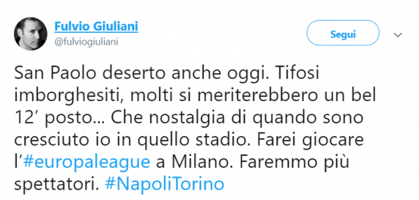 Fulvio Giuliani, collega di RTL, tramite il proprio account ufficiale di Twitter ha commentato la scarsa affluenza di pubblico delle ultime giornate di campionato del Napoli. Ecco il tweet: