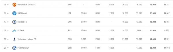 Comanda, ovviamente, il Real Madrid, subito seguito da Bayern Monaco e Barcellona sul podio. La Juventus, sconfitta contro l’Atletico Madrid, resta quinta. Alle spalle del Napoli, invece, club di tutto rispetto come Chelsea e Zenit San Pietroburgo.