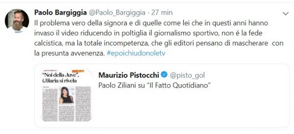 “Il problema vero della signora e di quelle come lei che in questi anni hanno invaso il video riducendo in poltiglia il giornalismo sportivo, non é la fede calcistica, ma la totale incompetenza, che gli editori pensano di mascherare con la presunta avvenenza. #epoichiudonoletv”.
