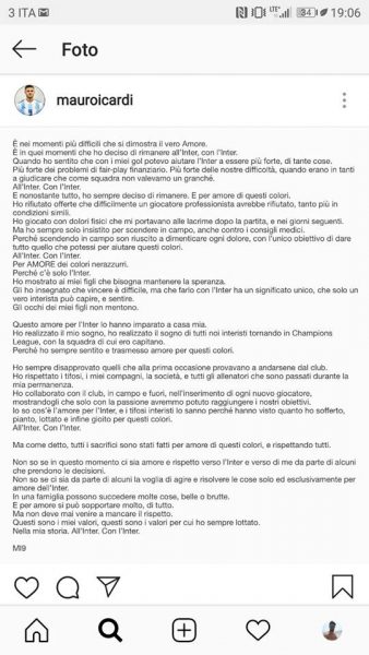 Non so se in questo momento ci sia amore e rispetto verso l’Inter e verso di me da parte di alcuni che prendono le decisioni. Non so se ci sia da parte di alcuni di agire e risolvere le cose solo ed esclusivamente per amore dell’Inter. In una famiglia possono succedere molte cose, belle o brutte. E per amore si può sopportare molto, di tutto. Ma non deve mai venire a mancare il rispetto. Questi sono i miei valori, questi sono i valori per cui ho sempre lottato. Nella mia storia. All’Inter. Con l’Inter. MI9″.