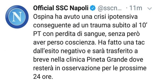 “Ospina ha avuto una crisi ipotensiva conseguente ad un trauma subito al 10’ PT con perdita di sangue, senza però aver perso coscienza. Ha fatto una tac dall’esito negativo e sarà trasferito a breve nella clinica Pineta Grande dove resterà in osservazione per le prossime 24 ore. “