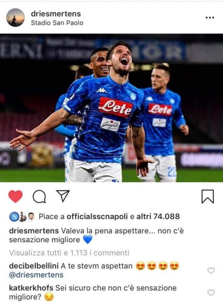 Simpatico botta e risposta su Instagram tra Dries Mertens e la moglie, Kat Kerkhofs. Dopo aver ritrovato la via del goal, che mancava dal 29 dicembre, Mertens ha celebrato con un post sul noto social network: