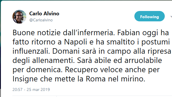 “Buone notizie dall’infermeria. Fabian oggi ha fatto ritorno a Napoli e ha smaltito i postumi influenzali. Domani sarà in campo alla ripresa degli allenamenti. Sarà abile ed arruolabile per domenica. Recupero veloce anche per Insigne che mette la Roma nel mirino.”