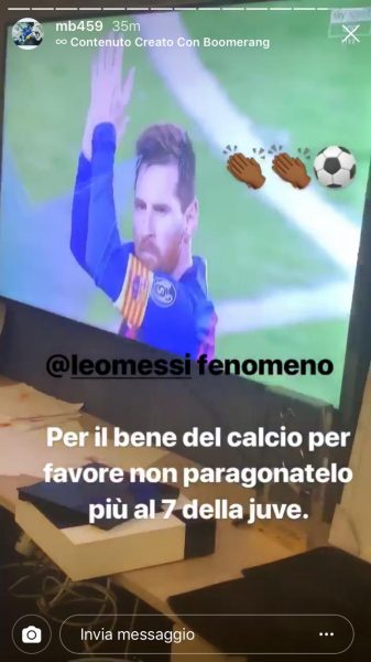 Una bordata a Cristiano Ronaldo arriva dai social. L’autore è Mario Balotelli, che fa discutere tramite Instagram. Commentando in una storia il goal di Messi, Mario scrive: “Fenomeno. Per il bene del calcio non paragonatelo più al 7 della Juve”. Una dichiarazione che creerà polemiche.
