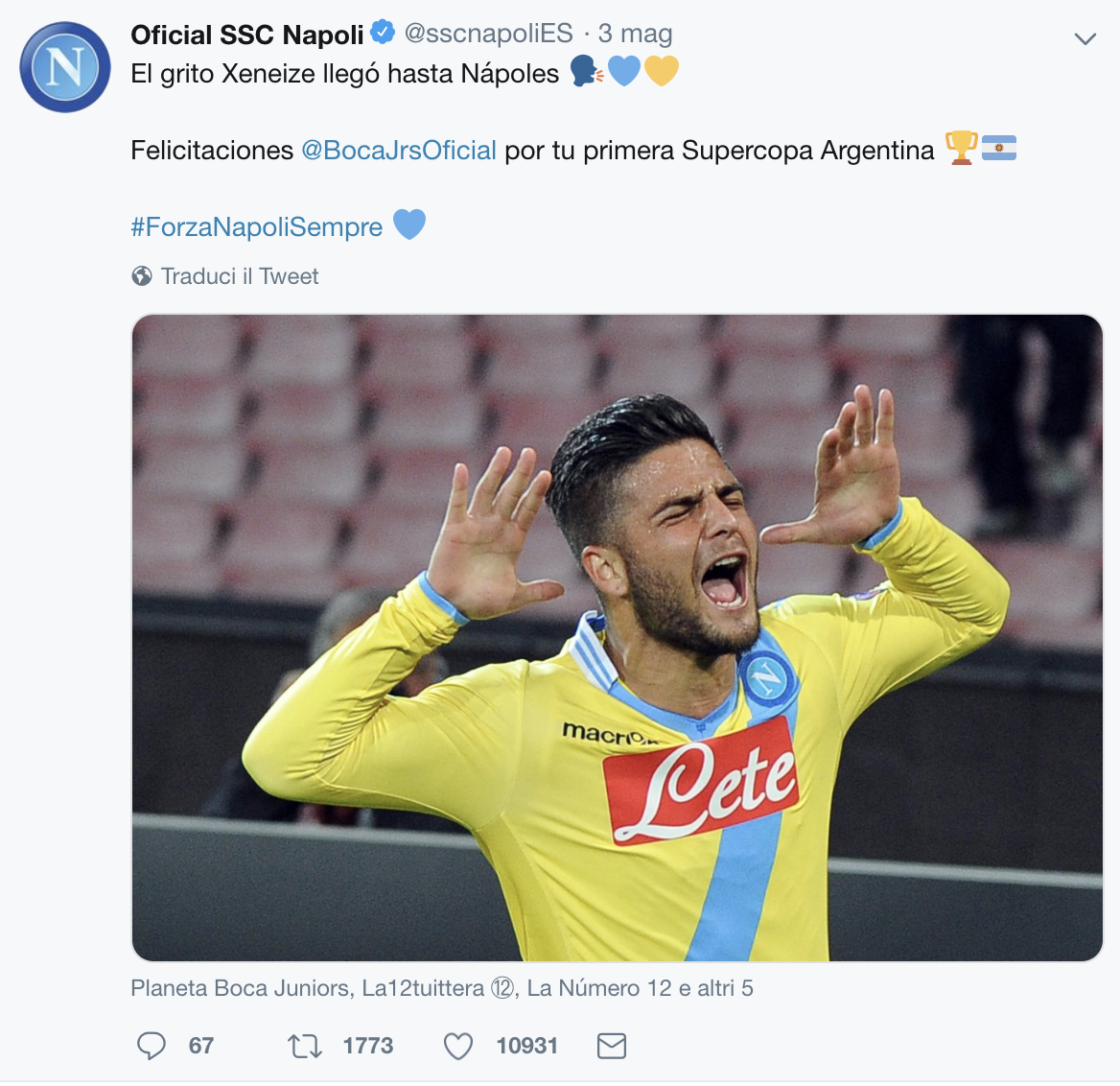 La società sportiva calcio Napoli si congratula con il Boca Juniors per la vincita della Supercoppa Argentina. Il tweet, scritto direttamente dall’account spagnolo, parla chiaro: “Il grido di Xeinezes è arrivato fin qui”. Il Boca Juniors ha battuto il Rosario Central ai calci di rigori per 6 a 5.