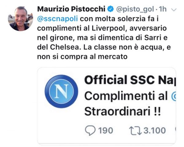 “Il Napoli con molta solerzia fa i complimenti al Liverpool, avversario nel girone, ma si dimentica di Sarri e del Chelsea. La classe non è acqua, e non si compra al mercato”.