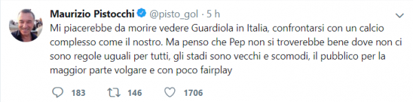 Il giornalista Maurizio Pistocchi, commenta tramite il suo profilo Twitter la vittoria della Premier League da parte del Manchester City di Guardiola e l’eventuale approdo del tecnico in Italia: