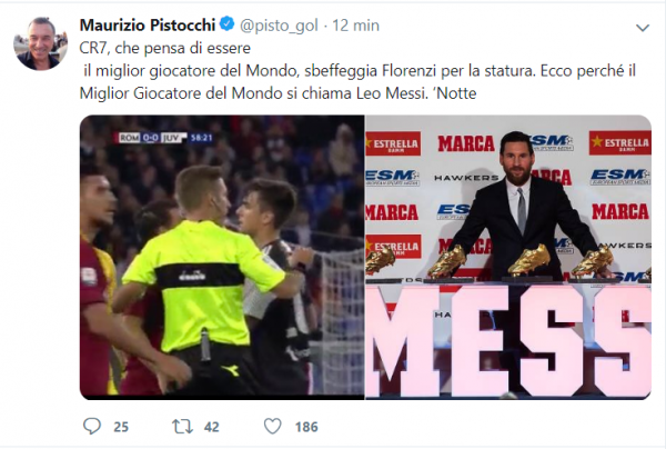 “CR7, che pensa di essere il miglior giocatore del Mondo, sbeffeggia Florenzi per la statura. Ecco perché il Miglior Giocatore del Mondo si chiama Leo Messi. Notte“.