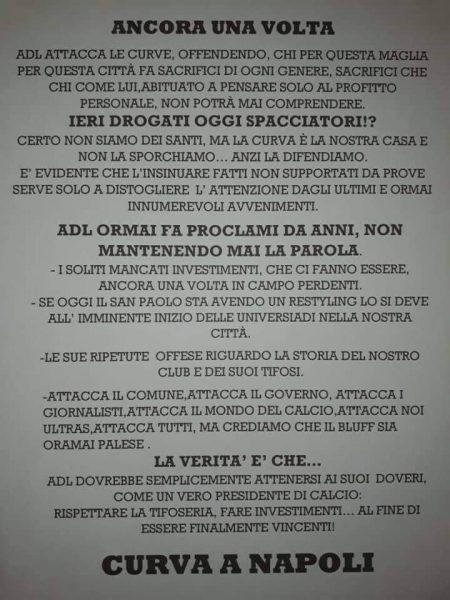 Le tensioni tra De Laurentiis e la tifoseria continuano ininterrotte. Dopo le dichiarazioni del presidente del Napoli (LEGGI QUI) arriva una risposta decisa da parte della Curva A. Ecco il comunicato: