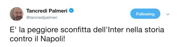 Napoli-Inter si è conclusa con la vittoria degli azzurri per 4-1! A segno Zielinski, Dries Mertens e Fabian, che ha realizzato una splendida doppietta! Così commenta Tancredi Palmieri a fine gara sui social: