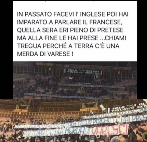 Nessuno ha dimenticato quanto accaduto, soprattutto gli Ultras partenopei che avevano subito il vile attacco. Ebbene durante l’ultimo match di campionato tra Napoli e Inter, i tifosi napoletani – come mostra su Twitter una foto pubblicata dal giornalista Fabio Ravezzani – hanno esposto uno striscione che ha attaccato Belardinelli: “In passato facevi l’inglese, poi hai imparato a parlare il francese. Quella sera eri pieno di pretese, ma alla fine le hai prese. Chiami tregua perché a terra c’è una mer… di Varese“.