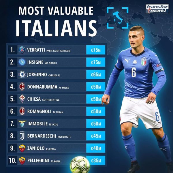 Il portale Transfermarkt, riferimento anche per gli addetti ai lavori, ha così stilato la classifica dei 10 calciatori italiani più costosi. Da notare che il primo posto viene condiviso da Marco Verratti e Lorenzo Insigne, al quale viene affidata una valutazione di 75 milioni di euro.