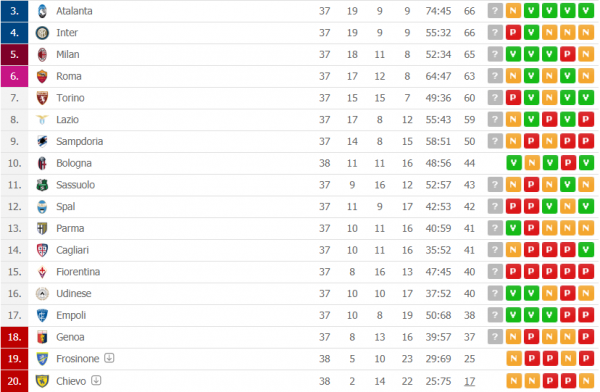 Questa la classifica parziale dell’ultima giornata di Serie A, in attesa delle partite che si disputeranno nella giornata di domani.