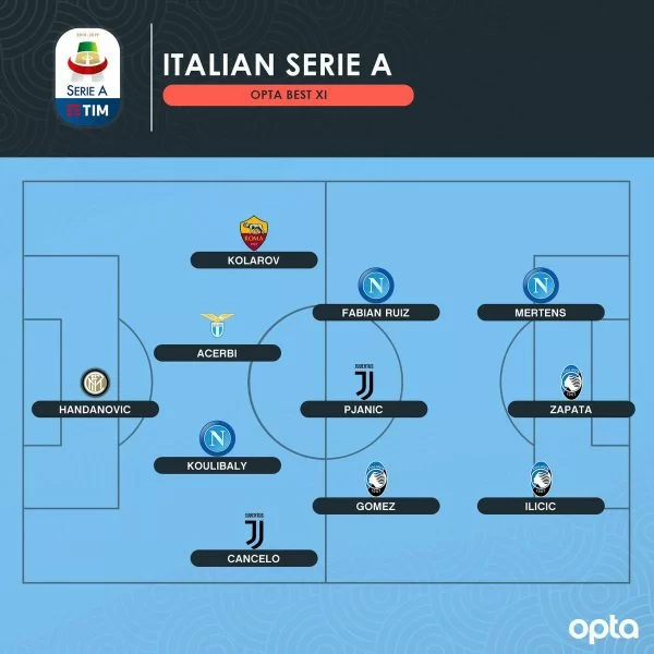Vediamo nello specifico da chi è formata questa top 11 della Serie A secondo i dati Opta: in porta c’è l’estremo difensore dell’Inter, Samir Handanovic. In difesa troviamo Joao Cancelo della Juventus, Kalidou Koulibaly del Napoli, Francesco Acerbi della Lazio e Aleksandar Kolarov. A centrocampo ci sono Fabian Ruiz del Napoli, Miralem Pjanic della Juventus e Alejandro Gomez dell’Atalanta. In attacco tridente formato da Josip Ilicic dell’Atalanta, Dries Mertens del Napoli e Duvan Zapata dell’Atalanta.