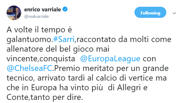 “A volte il tempo è galantuomo. Sarri raccontato da molti come allenatore del bel gioco mai vincente, conquista l’Europa League con il Chelsea. Premio meritato per un grande tecnico, arrivato tardi al calcio di vertice ma che in Europa ha vinto più di Allegri e Conte, tanto per dire“.