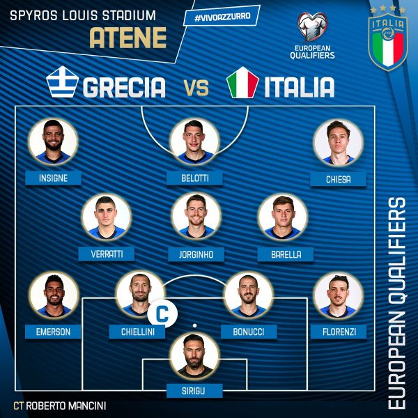 ITALIA (4-3-3): Sirigu; Florenzi, Bonucci, Chiellini, Emerson Palmieri; Verratti, Jorginho, Barella; Chiesa, Belotti, Insigne. Allenatore: Mancini.