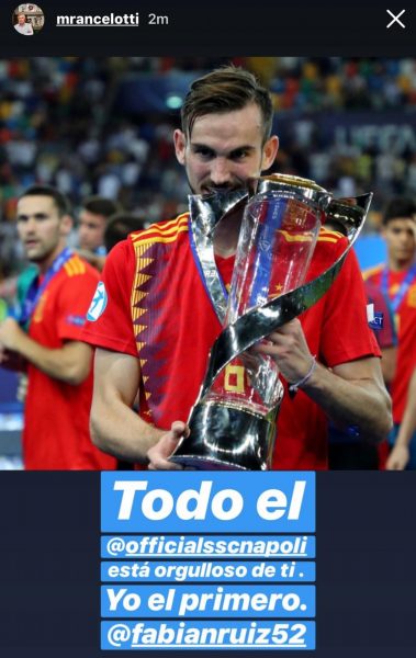 Il tecnico del Napoli si è congratulato su Instagram, scrivendo: “Tutto il Napoli è orgoglioso di te, io per primo”.
