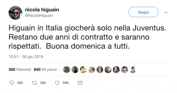 “Higuain in Italia giocherà solo nella Juventus. Restano due anni di contratto e saranno rispettati. Buona domenica a tutti.”