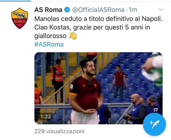 AGGIORNAMENTO 22.20 – Arriva il tweet ufficiale: Kostas Manolas è un calciatore del Napoli. L’ha comunicato la Roma sui suoi social. Questo il tweet: